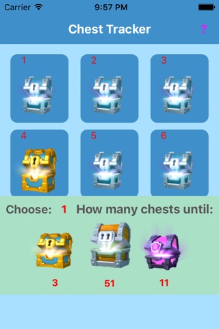 Chest Tracker for Clash Royale helps you track your chests and figure out when the golden, giant and magical chests are bound to hit.
