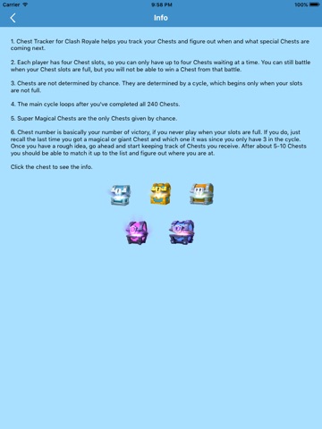 This is an UNOFFICIAL chest tracker tool for Clash Royale. It is developed by an independent developer, not affiliated to the game developer or publisher. The app is intended purely to assist players, and is intended to be used alongside the game. All characters, chests and game logos are the property of their respective owners. Usage in this app falls within guidelines of "fair use".