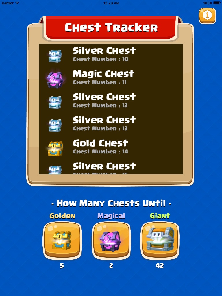►This app allows you to track your current chest location in the rotating as well as telling you how many more chests until Golden, Magical, Giant and Super Magical.