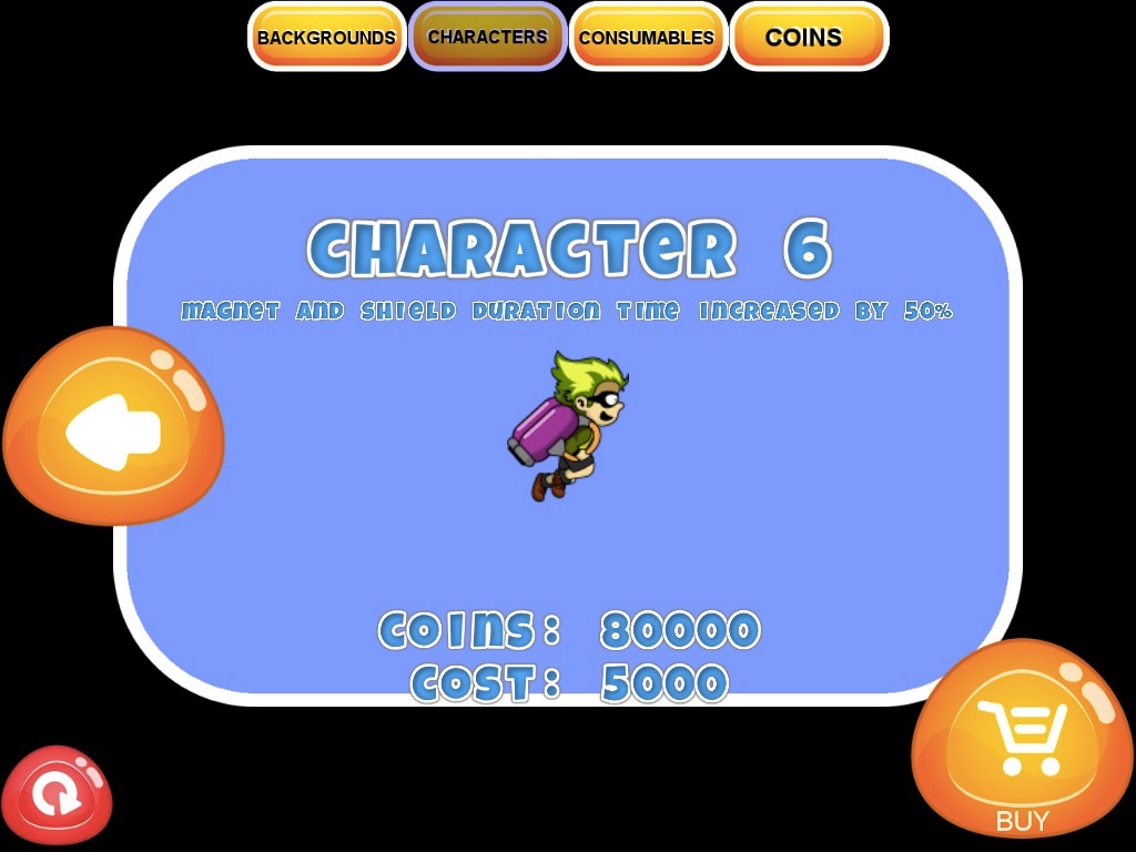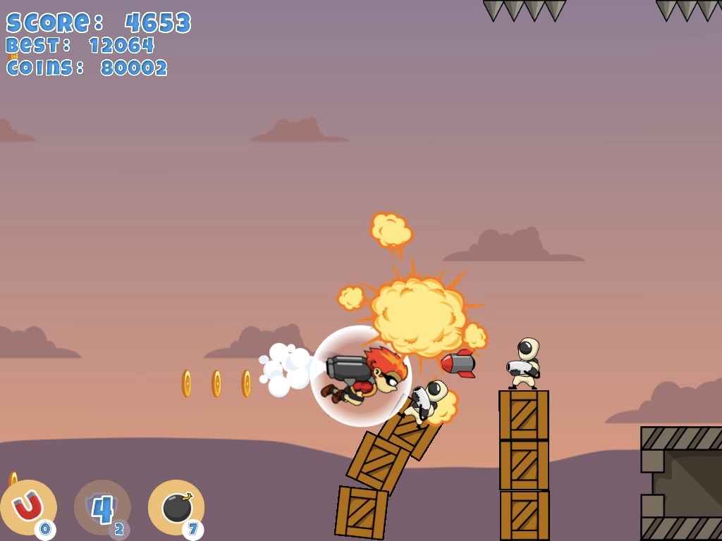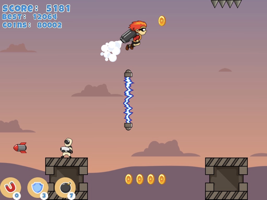 Use the jetpack and fly as far as you can avoiding obstacles! Unlock new backgrounds, new characters and buy consumables!
