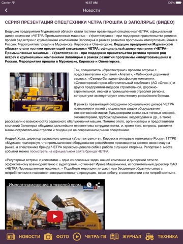 CHETRAmobile - приложение, которое позволит вам быть в курсе всех последних событий в мире ЧЕТРА: читать самые свежие новости, смотреть фото- и видеорепортажи с испытаний техники, выставок, презентаций и конкурсов, знакомиться с экспертными мнениями аналитиков компании о ситуации на рынке спецтехники. Также в CHETRAmobile Вы найдете удобный каталог техники ЧЕТРА с характеристиками и фотографиями бульдозеров, экскаваторов, трубоукладчиков, погрузчиков, вездеходов и другой техники ЧЕТРА.
