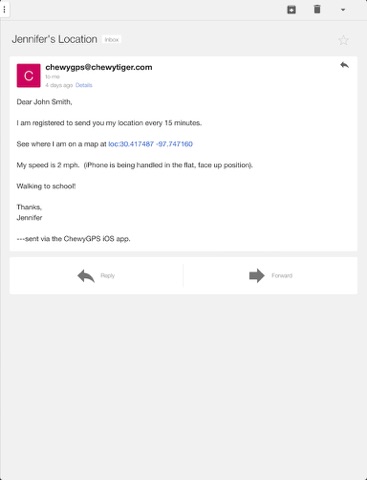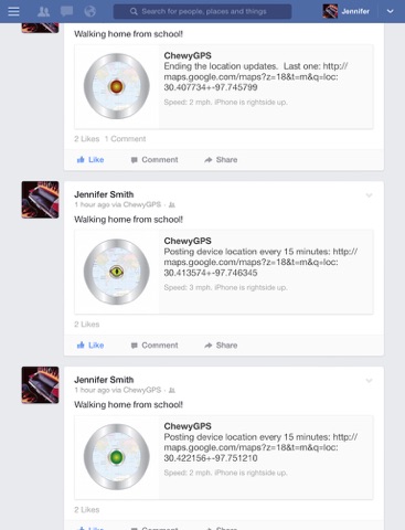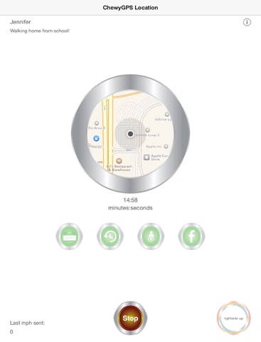 ChewyGPS runs in the background to periodically send device location, motion, and position updates by email to selected contacts without you having to touch your phone. ChewyGPS can also post your location and devices information to Facebook. Good use cases for using ChewyGPS would be to let those without iOS devices know your location every so often while you are running a marathon, driving, or performing errands without even having to touch your phone! No more having to bother updating people with where youre at and what youre doing. ChewyGPS will handle that.