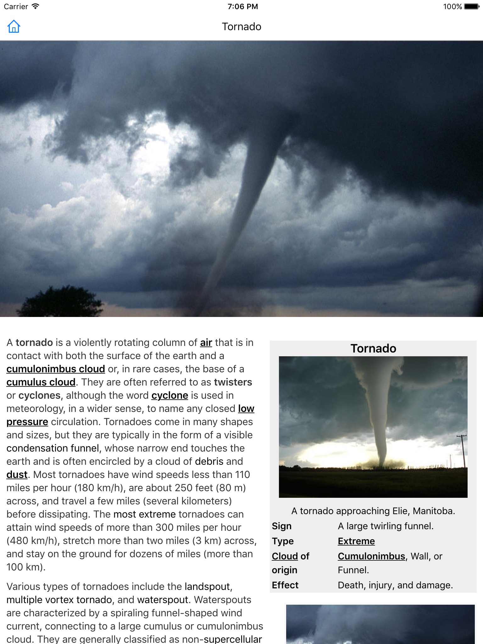 Explore the weather of the world in thousands of hours of articles and pictures covering everything from acid rain to wind shear. Our Encyclopedia of Weather contains beautiful HD photos, great organization and user interface and the most comprehensive information about weather you may want to know.