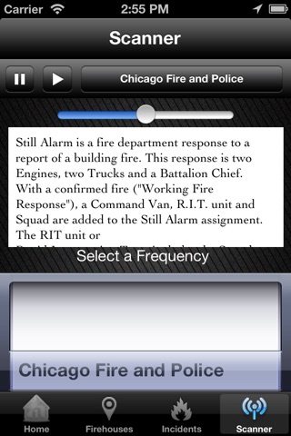The ultimate Buff app is finally here! With Fire Buff you are able to search the locations of hundreds of firehouses throughout the city of Chicago! Find which ones are near YOU! With our Incidents page you can search all of the current incidents occurring. Easily search the incidents locations and find out which Fire Departments are responding! Want to feel like your on scene? Use our Scanner page to listen to live streaming fire and police frequencies! What to feel like a dispatcher? Use the Report Incident button to report an incident you heard about or saw! Keep track of all the firehouses youve seen with the "My Firehouse" section!