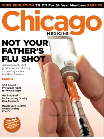 Chicago Medicine magazine updates members on the workings of the Society, including committee structure, CMS Council makeup, and upcoming events. The publication also addresses broad issues of concern to physicians across all specialties with original articles by local doctors on technical and non-technical topics, historical essays, opinion pieces, and human interest stories. Regular departments include a column by the CMS president, and legal and financial advice.