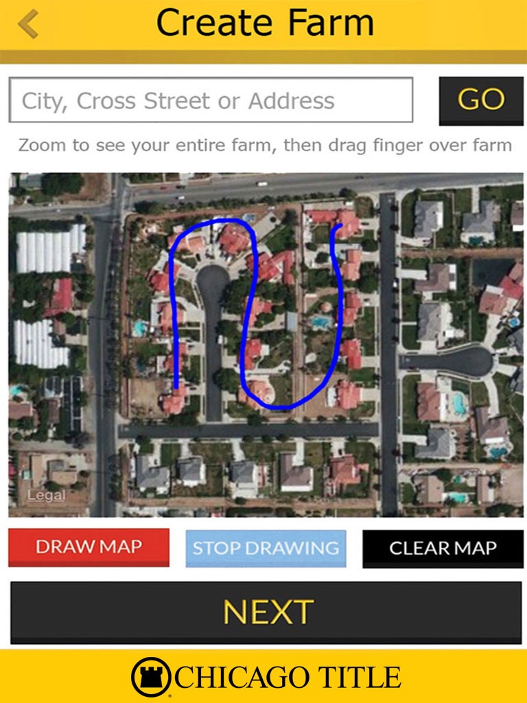 Using the Chicago Title Walking Farm App, you simply select the area you want to walk by drawing a line using your FINGERTIP through the properties on an aerial map in the order you intend to walk the Farm. When you are satisfied with your selection, the App will return a list of properties in walking order. Or draw a polygon area using your FINGERTIP to return information on all properties within that area. The information can then be managed from your device; notes can be added to each record for follow up activities.