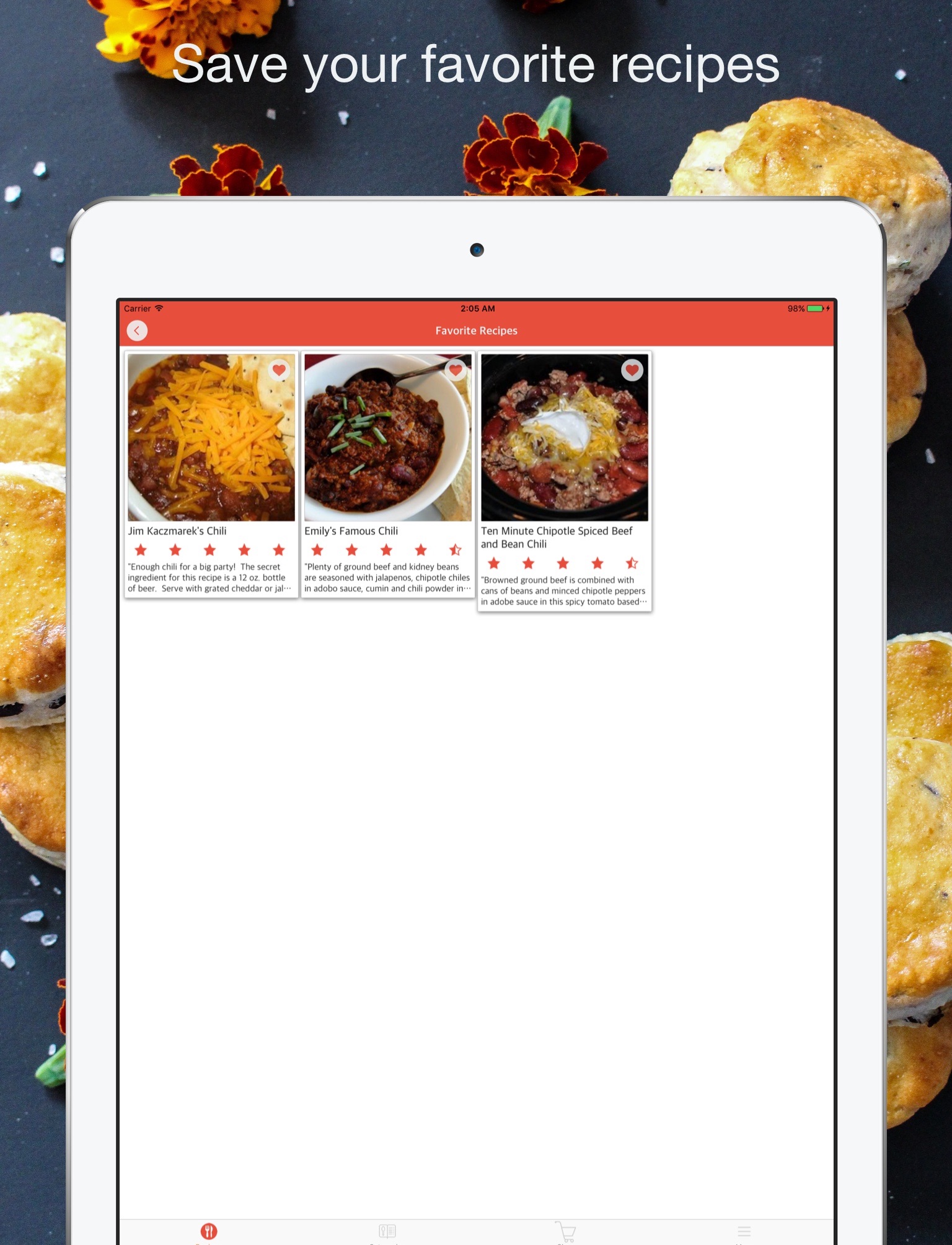 - Use Favorite and Shopping list to save your recipe and ingredients