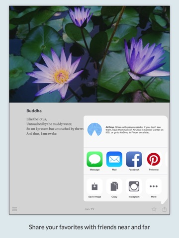 Turn the quotes and images into shareable photos for Facebook, Twitter, Instagram, text messages, email, and any other app that supports iOS share sheets.