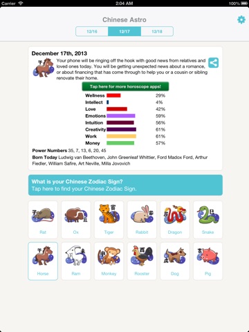 - Explore the horoscopes & predictions for all 12 zodiac signs of Chinese Astrology (Rat, Ox, Tiger, Rabbit, Dragon, Snake, Horse, Goat, Monkey, Rooster, Dog, Pig) within this free app.