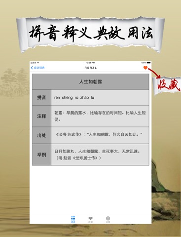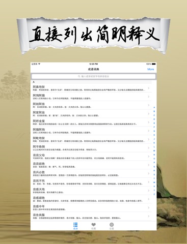 《成语大词典》提供快速搜索的功能,并独家支持首字母拼音检索,只需要输入成语中每个汉字拼音的首字母即可检索,非常便捷。