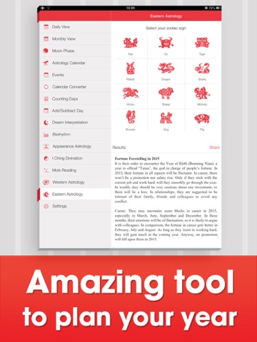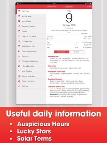 What will 2017 bring? Will you get rich? Should you continue with the same job or look for a new one? Will you find your true love? Get answers to all these questions with our useful Chinese Calendar app. Clearly illustrated in English and easy to use, the app provides information on auspicious dates and hours, lucky stars, moon phases, solar terms to help you make important decisions, such as buying a house, finding a new job or getting married.