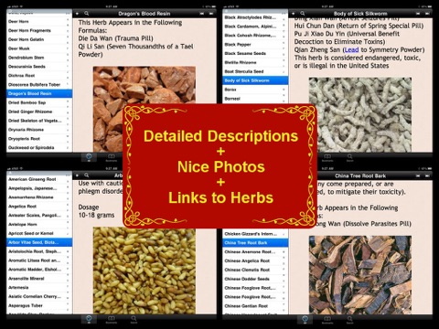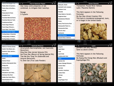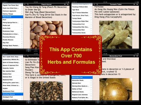 In addition to individual herbs, this App also contains 250 common Chinese Herbal formulas, from curing influenza to providing extra nutrition to a pregnant mother. The following info is included in each herbal formula: