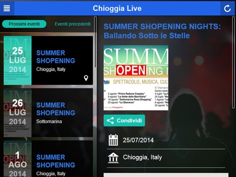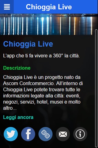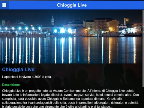 Chioggia Live è l’app che ti fa conoscere le città di Chioggia e Sottomarina a 360° in modo divertente. Eventi, attrazioni turistiche e culturali, negozi, servizi e hotel: Chioggia Live sarà la tua guida per vivere la città in tutta semplicità.