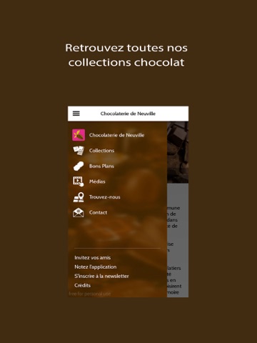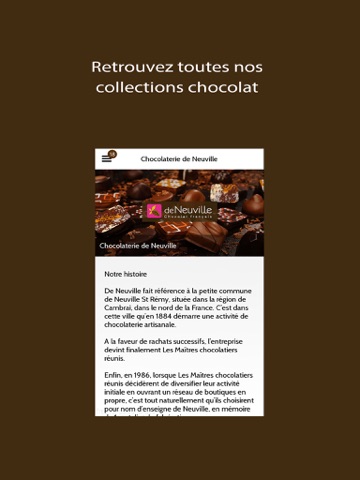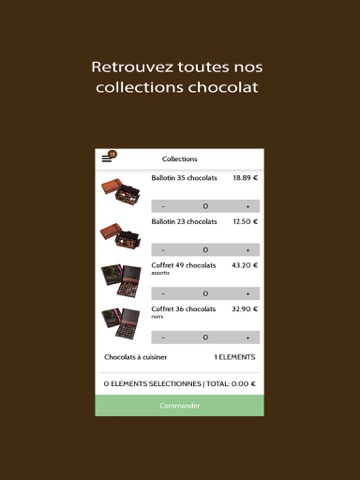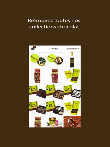 Lapplication vous permet de consulter nos collections et de commander des ballotins de chocolats.