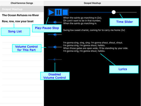 Choirherence Practice Companion helps you practice the songs we do in the Choirherence choir. You can control the volume of each part separately, so you can do any of the following: