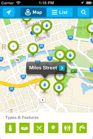 • Find additional features at each tap such as toilets, barbeques and dog bowls
