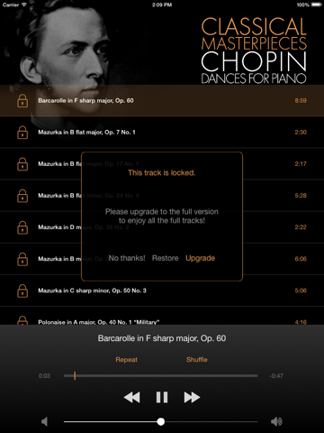 The Classical Masterpieces: Chopin Dances for Piano collects the Composer’s most popular and best-known mazurkas, polonaises, valses and his barcarolle to a simple, easy to use iPhone and iPad optimized interface. 14 tracks of the greatest performers from one of the greatest masters of music history.