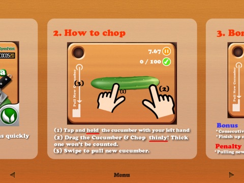 * Tap and Hold the cucumber with your left forefinger. You can bang down knife only while cucumber has been held!