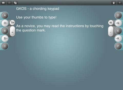 This App offers a chorded keyboard where you can enter characters by pressing several keys together, like playing a chord on a piano. It is based on an open keyboard standard called GKOS.