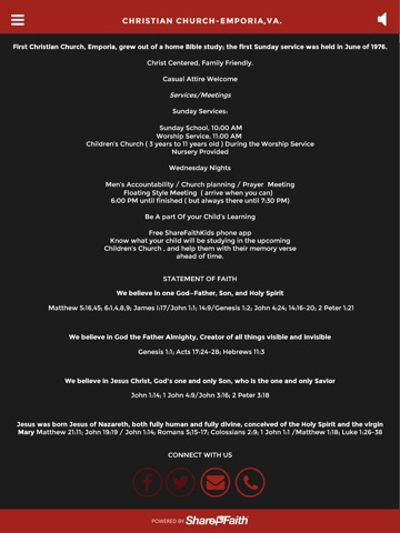 First Christian Church, Emporia Virginia, APP. Connect to see what we believe, how we worship, and what our upcoming events are. Listen to audio sermons and receive devotional blogs. Its not about us. Its about God, and His son, Jesus Christ.