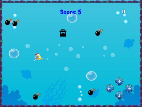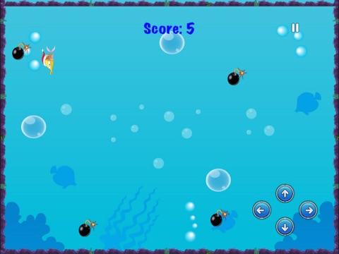 Tap the screen to start. Press the arrows up, down, left and right to steer the fish to the direction you desire. Collect fishes along the way to score. Avoid bumping on all sides as well as on other objects.