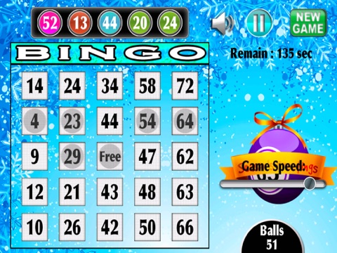Enjoy the classic Bingo style and play in a beautiful and wonderful frozen world perfect for Christmas holidays! Play completely for free and enjoy the virtual Bingo caller as you daub your card over and over until you win!