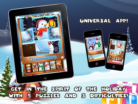 Get in the spirit of Christmas and the holidays with this beautiful sliding puzzle. Choose from 3 difficulties and 5 festive pictures. Also great for kids problem solving abilities. The 2x2 puzzle is perfect for very young children, and the 3x3 and 4x4 is for boggling the minds of us adults.