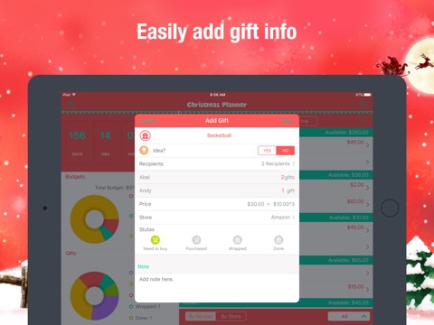 ⁃ Add gift info with picture, quantity, recipients, price, store and status.