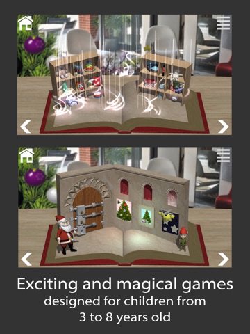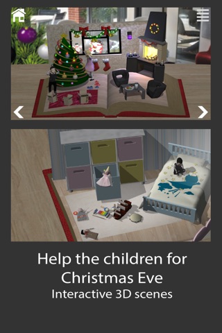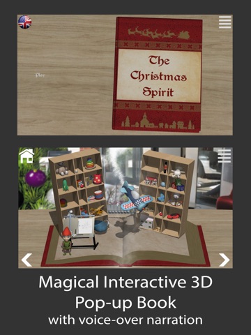 The Christmas Spirit is an interactive 3D pop-up book for children from 3 to 8 years old. It tells the story of a little elf who, at Christmas Eve, loses inspiration and is not able to create new toys. In the meantime, the family of Lucas and Emma is preparing for Christmas Eve, but will they receive their gifts in time for Christmas? Through 40 pages of text and 9 pop-up interactive scenes, the player and Santa Claus have to help the elf recover his spirit of Christmas so no children are forgotten.