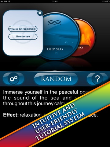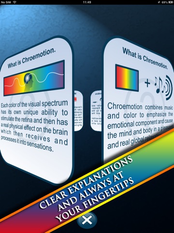 Chroemotion (Chromatic emotion), è un potente alleato. Con Chroemotion, infatti, sarete capaci di entrare in un profondo stato di relax e accrescere il vostro substrato emotivo e creativo. Questa nuova applicazione utilizza una particolare combinazione di suoni costruiti per “far vibrare” determinate corde della parte emotiva del cervello e contemporaneamente proiettare una serie di colori specifici capaci di condurre il fruitore in uno stato emotivo piacevole che non solo lo rilassa ma lo accresce.
