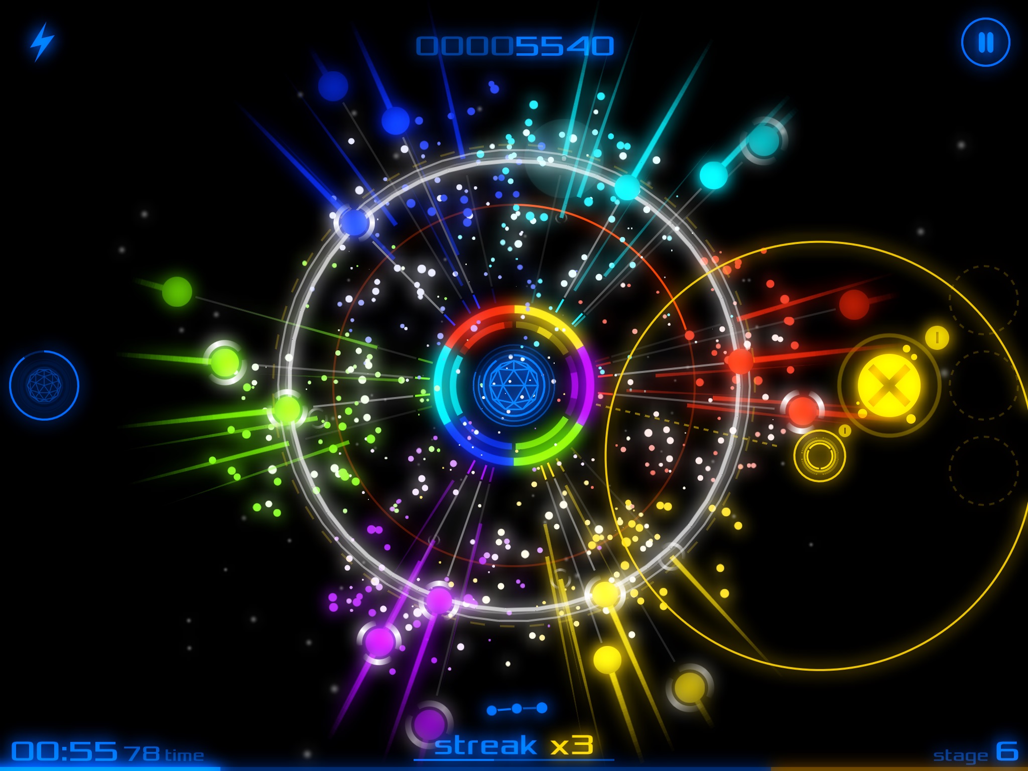 • Protect the Core from being hit by colorful orbs by intercepting them with the Shield.