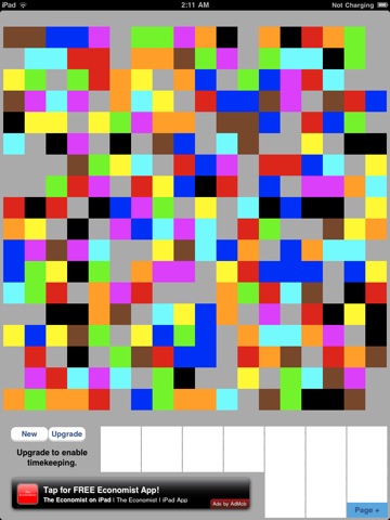 To play, press one of the color patterns below the play field then touch the square where you think the first cell of the pattern should go. There may be a second and third page of patterns - press the "+" (page up) button to access these additional pages.