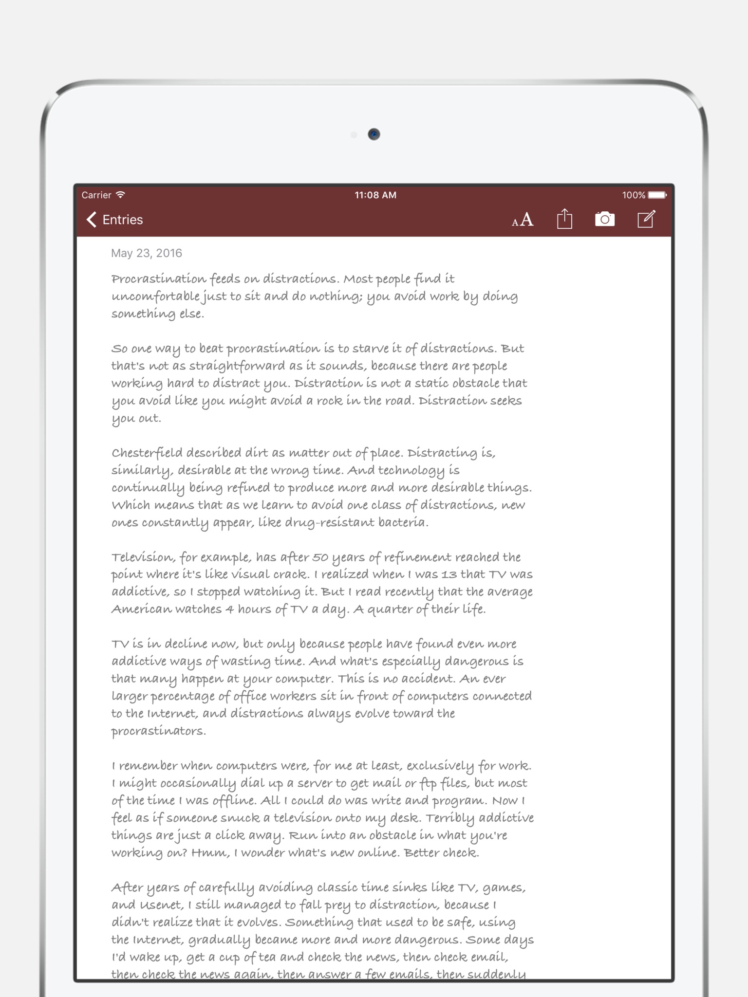 This app is real great journal app. I really recommend it for simple and quick notes taking. Export to Google apps is a+. Would only suggest that the text be reorganized automatically around the pictures when dragging them and add a search functionality. Very effective otherwise.