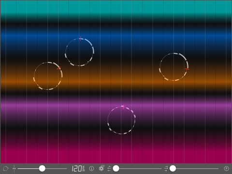 The main user interface consists of a fingerboard and a control bar. Touch the fingerboard to start, stop, or modify a voice. The horizontal axis of the fingerboard corresponds to different frequencies, similar to a guitar fingerboard. The vertical axis corresponds to different sounds and rhythm patterns which you can configure. When a voice is playing, the corresponding rhythm pattern is shown as a loop around the touch position, along with the red play cursor. On 3D Touch devices (for example iPhone 6S), the pressure applied to the fingerboard affects the sound by changing filter parameters or modulation depths. On other devices, the same parameters are controlled by an estimate of the surface touched by your finger.