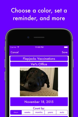 Countdown to birthdays, upcoming vacations, your wedding day, anniversaries, your last doctor visit, vet visits, prescription fill dates, holidays, historic events, employment milestones, and more.