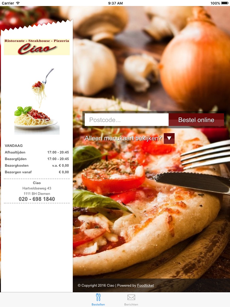 Met de Ciao app bestel je veilig en snel de lekkerste pizza, steak, soep, snacks en meer van Diemen en omstreken. Direct online betalen via je eigen bank met iDEAL!
