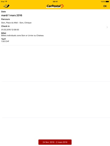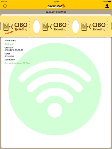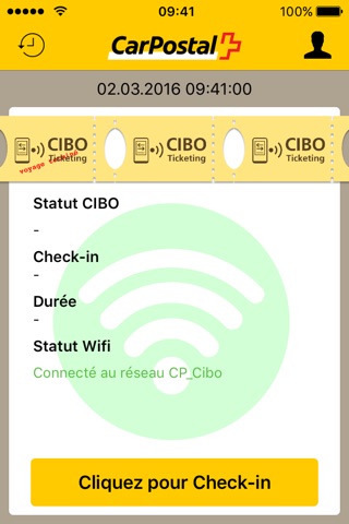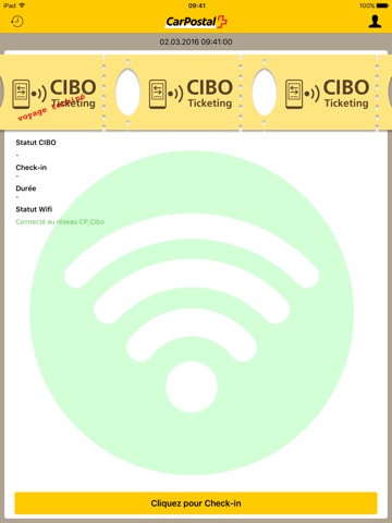 Une appli de ticketing sur la base de la procédure Check-In Be-Out (CIBO) pour un essai pilote dans le cadre du MobilityLab (porté par La Poste, CarPostal, EPFLausanne, HES-SO, Canton du Valais, Ville de Sion). Lapplication se connecte automatiquement au router WLAN dans le véhicule de CarPostal. Au début de son parcours le passager pousse le button Check-In. Le calcul de son itinéraire et en particulier la detection de sa sortie se font automatiquement et immédiatement lorsque la connexion avec le router se coupe.