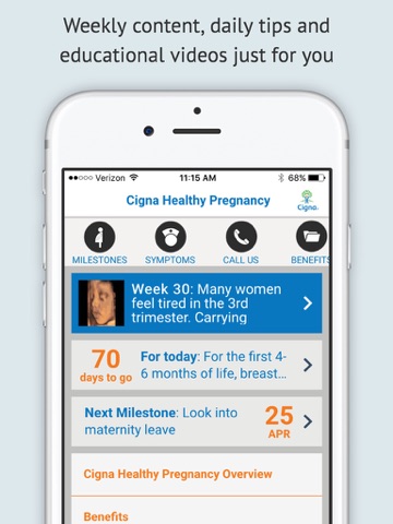 This app is designed to give you the support you need to actively manage your pregnancy and help keep you and your baby as healthy as possible. You also can use it to find local resources and learn about Cigna programs you may be eligible for, such as the Cigna Healthy Pregnancies, Healthy Babies® program.