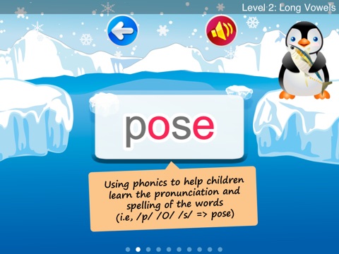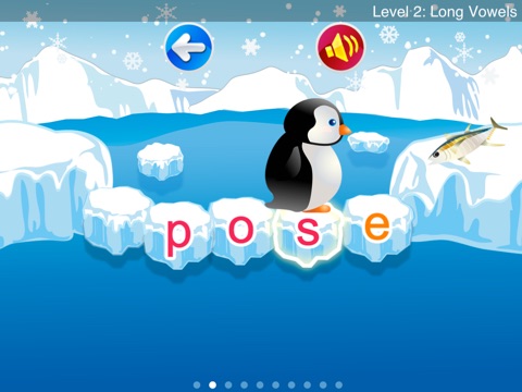 This is a great app for beginning readers to learn words. Some of the apps 1,122 words can be sounded out using common phonics rules (i.e, grouped by short vowel, long vowel, Bossy Rs and other vowel team words --968 words), and others do not follow those normal rules and must be memorized (i.e, beard, climb, flood, great, snow, world etc. --154 words). Learning to spell these words adds to a strong foundation in reading and spelling for beginning readers. This app also uses phonics to help your child learn new words by putting sounds together to make words (like /b/ /a/ /t/ bat). So your child will be able to read and write words correctly without memorizing. So your child would be able to spell words correctly without memorizing. In this game, your child will help Cimo the penguin reach an iceberg to catch fish. Each correct letter chosen adds a block to his bridge. Finish the word and Cimo can cross, but watch out for wrong letters, or Cimo will take a dip! This is the fun game to improve your childs spelling abilities.