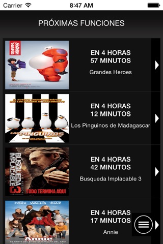 Muestra las películas que se están presentando, pero los horarios no los carga ni las «próximas funciones».