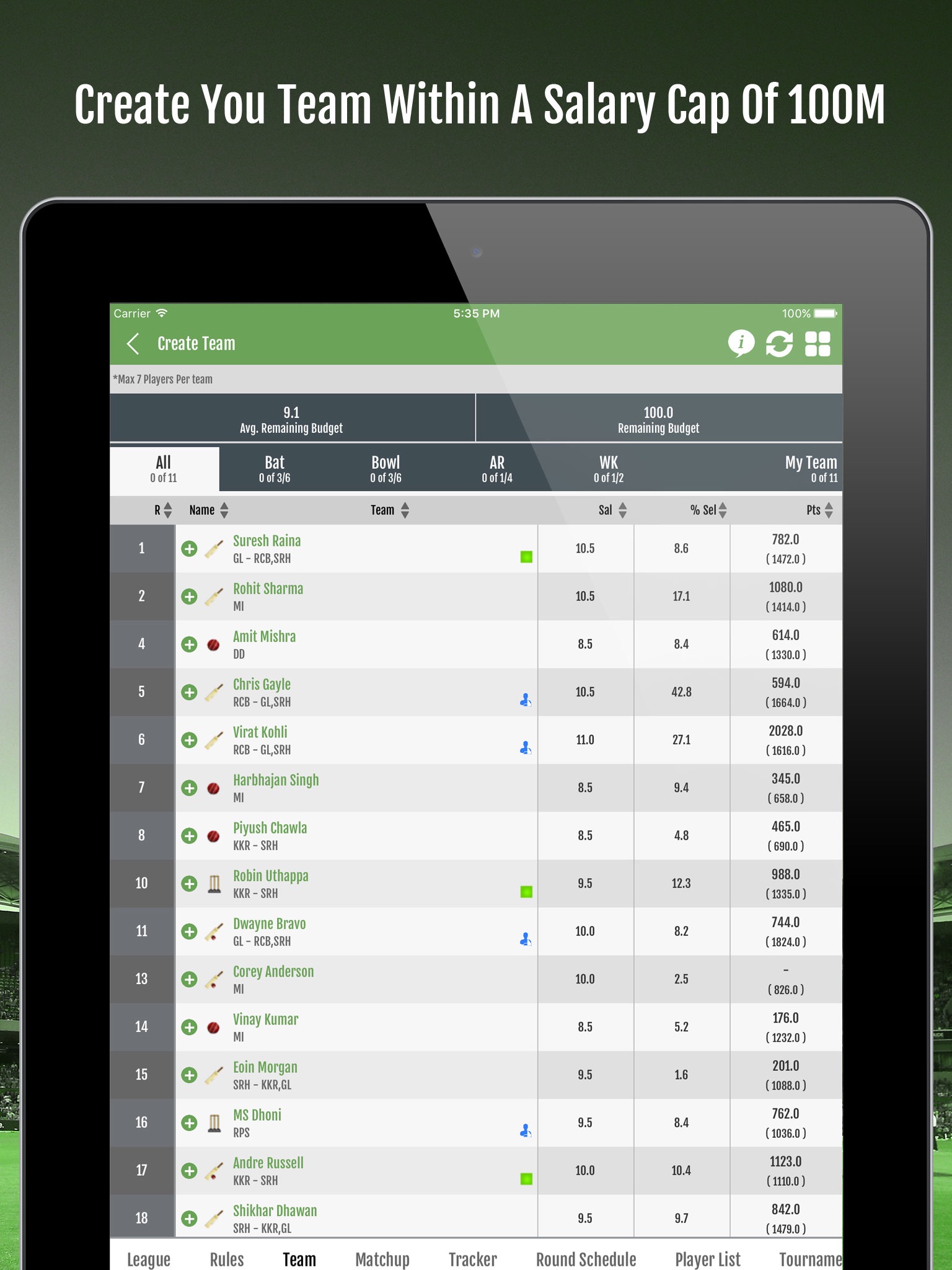 Step 3: Create your team within a budget of 100 credits (IMPORTANT: You have to do this before the real match starts). You can edit/update your team till the match start