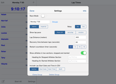 Each athlete in each group can have a different lap length and a different recovery period - double-tap the athlete in the group list to modify the athlete’s lap length and recovery period.