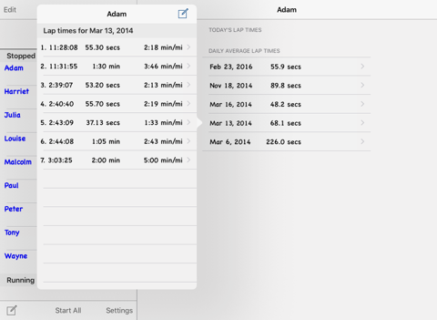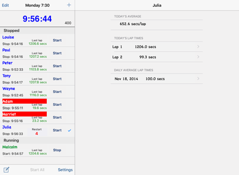 Used this lap timer for a running session for a group of triathletes, we set up different rests for different athletes and set them all off. The app worked very well, last split available when they compete that lap. All their splits available at the end of the session. Will use again. App scrolls so you can add plenty of athletes. App does flash up the name of the athlete when their rest time is over.