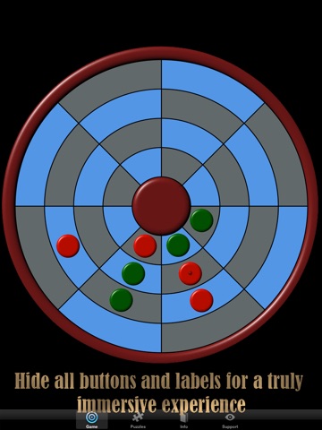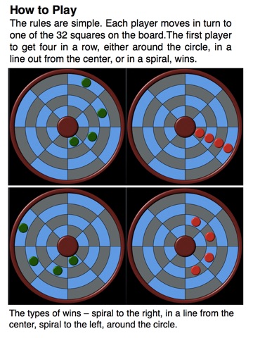 The game consists of a circular board divided by a grid into 32 squares. The players place pieces in consecutive turns with the objective being to get four pieces in a row around the circle, four in a line out from the center, or four in a spiral.