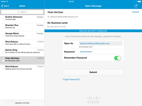 Cisco BCE provides enhanced email security features such as read receipts, email recall, email expiration, and forward/reply control. Additionally, BCE removes the complexity of encryption and key management, so users can send and receive highly secure messages directly from their mobile devices. The primary benefits of the Cisco BCE application are: