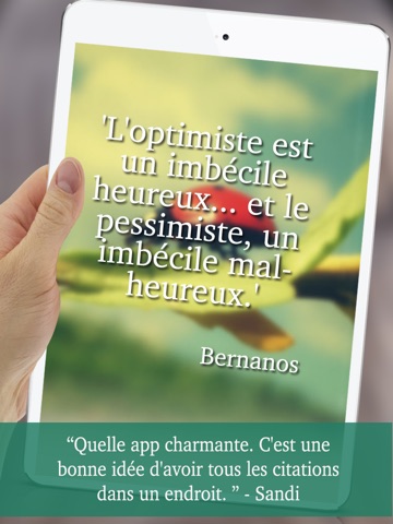 Linterface et la programmation de lappli sont des plus pauvres voir aberrantes. Même en désactivant le défilement auto des phrases, certaines napparaissent quune demi seconde. - un commentaire - une mise en situation - une anecdote - une fonction Shake pour changer de citation - un classement/recherche par thème et/ou auteur - une option proposition ce citation - et bon sang ! Un zest de design Si avec cela tu ne nous ponds pas une Vers. 2.0 ...