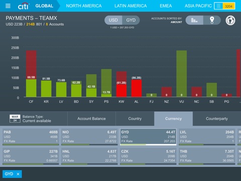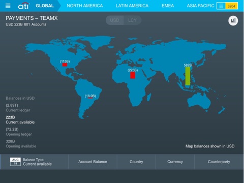 - View real-time account balances in three geographical views – global, regional and country