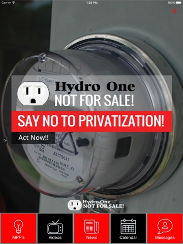 Download this app today to help fight the disastrous campaign by the Wynne government to sell off Ontarios Hydro. Just because shes sold off the first batch of shares doesnt mean this fight is over! Its only over when we give up! The Citizens Coalition against Privatization (CCAP) has been organizing a strong opposition movement to the sale. This app will help you to be active and have your voice heard. Flood your local MPP with calls, letters and emails. Join one of our local region chapters and attend a public meeting. We need to hear your voice! Lets act now to stop privatization. Hydro One is your business. Stand up. Be heard. Download the Hydro One Not Sale App today and say NO to the sell-off and keep Hydro public!