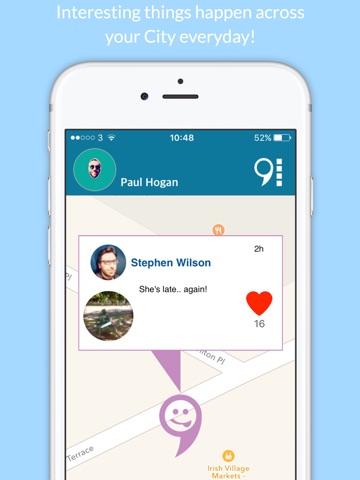 Share interesting events with other people across your City by posting messages and photos on the map. You can also view whats happening across the globe by simply navigating to the place of interest.