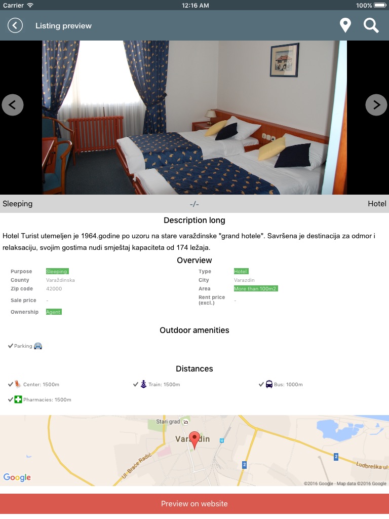 - Locations preview contains slider for gallery, overview, amenities, distances, location map, agent details and link to location preview on website